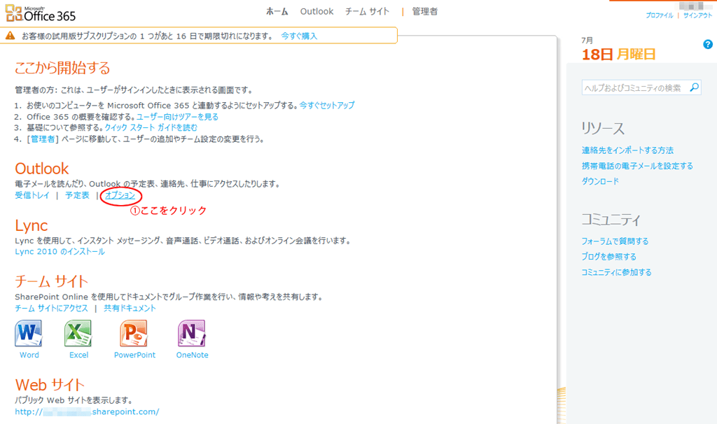 まず、Office 365 のホームにサインインします。Outlook のオプションを表示するリンクがあるので(1)クリックして、オプション画面を開きます。