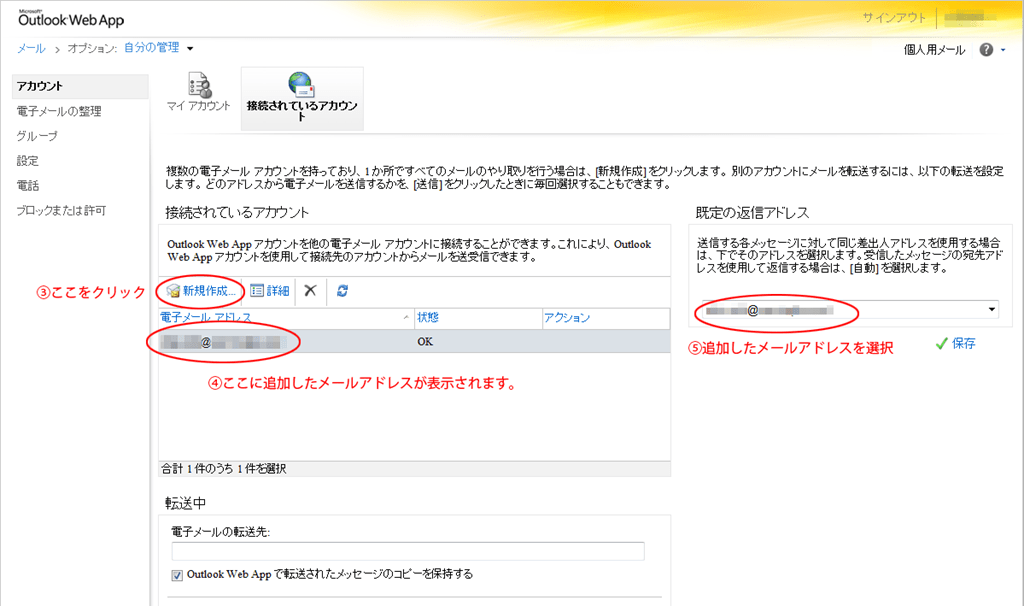 接続されているアカウントの設定画面で、(3)「新規作成」ボタンを押して自分の現在のメールアドレスの設定を追加します。