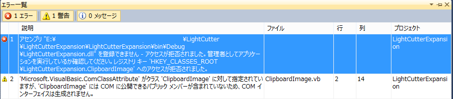 エラーは、COMクラスをテストできるようにシステムに登録するには、Visual Studio を「管理者権限」で起動するように、ということです。ビルド時にCOMクラスを登録してくれるようになっているので、簡単にテストができます。そのために管理者権限で起動しましょう。