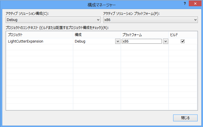 もう一つ、準備で必要なのが、構成マネージャーで、ビルドのプラットフォームを AnyCPU から x86 に変更しておきます。今回作成する COM は x86 からしか使用しないので、不要なのかもしれませんが、変更しておきます。