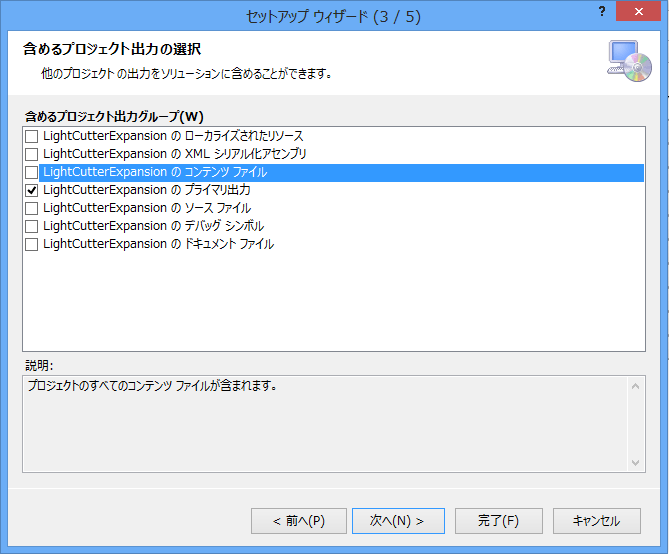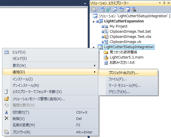 ソリューションに追加できたら、今度はインストーラのプロジェクトに COM クラスの「プロジェクト出力」を追加します。